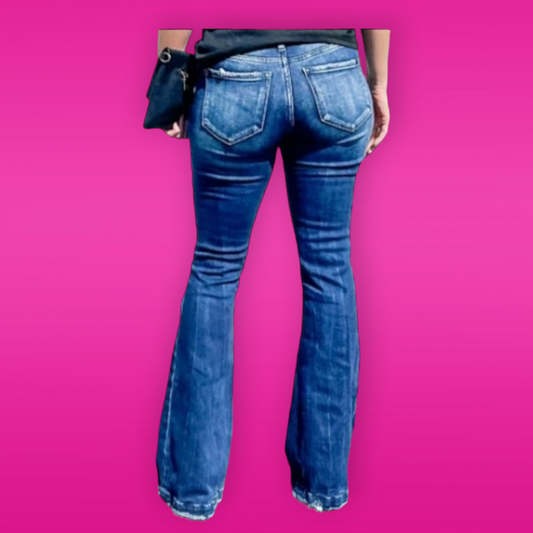 Distressed Mid Rise Stretch Flare Jean - Dark Wash