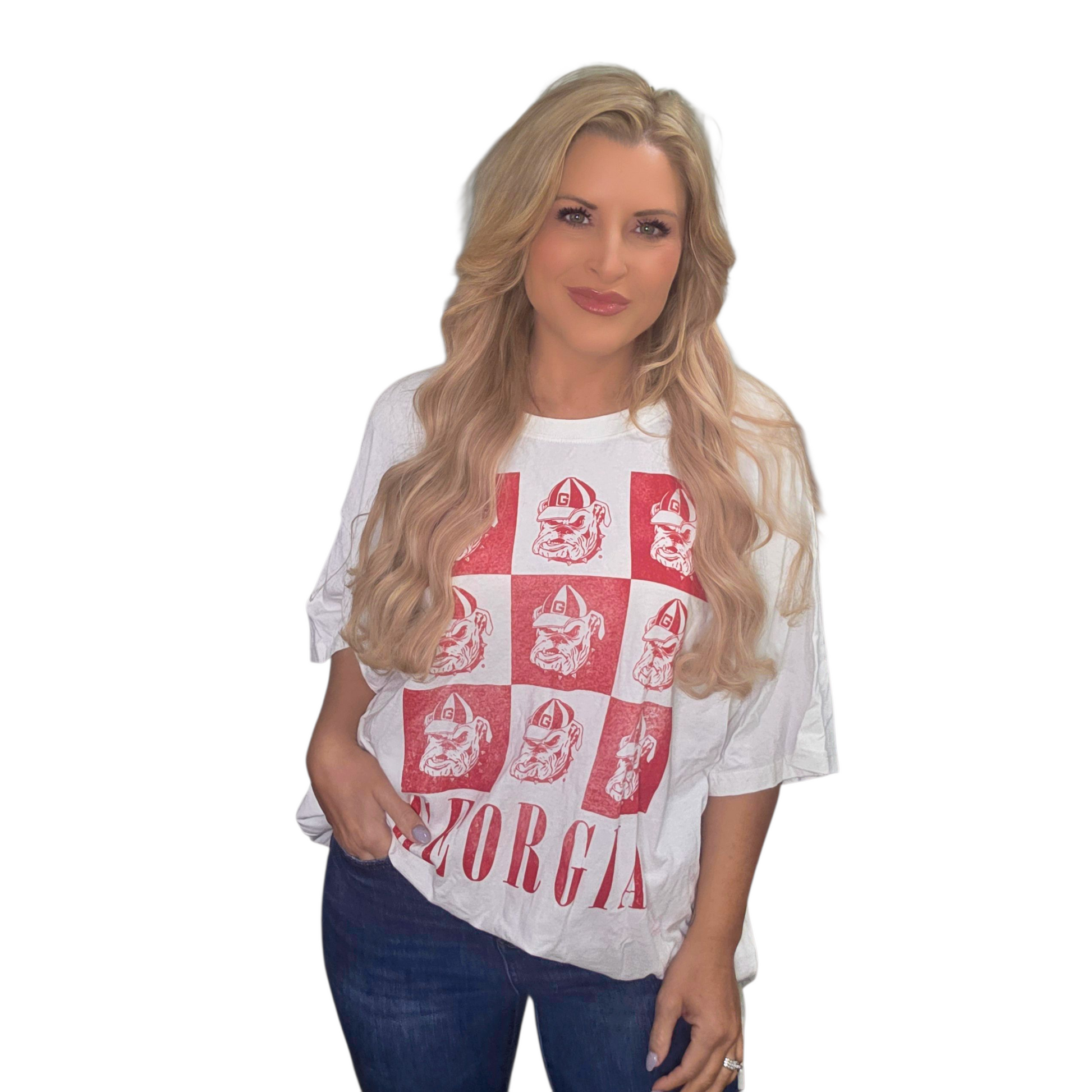 This UGA Oversized Tee is your ticket to showing off your GA pride! Just slip it on and you'll be enveloped in all-encompassing comfort and a checkered power Georgia graphic that will help you stand out from the crowd. Plus, it's officially licensed by the university! Go Dawgs!