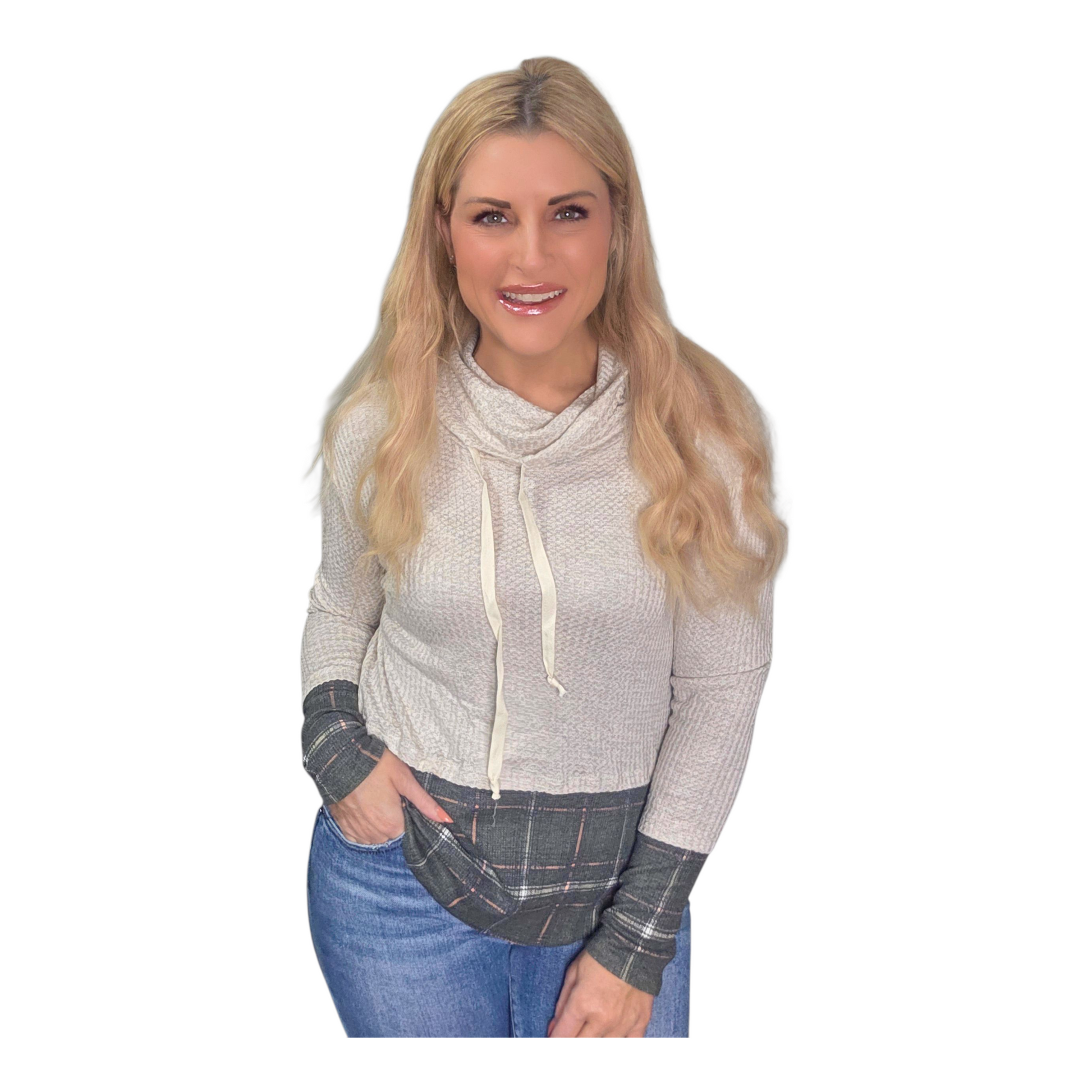 Introducing our lightweight waffle knit pullover, a versatile addition to your wardrobe. Crafted with a breathable fabric, it's perfect for transitional seasons. The adjustable drawstring neckline adds a customizable touch, allowing you to style it to your preference. The plaid detailing along the bottom half gives a subtle yet charming accent, adding a touch of flair to your look. Whether you're dressing it up for a casual outing or keeping it cozy at home, this pullover offers both comfort and style. Elevate your collection with this chic and functional waffle knit pullover.