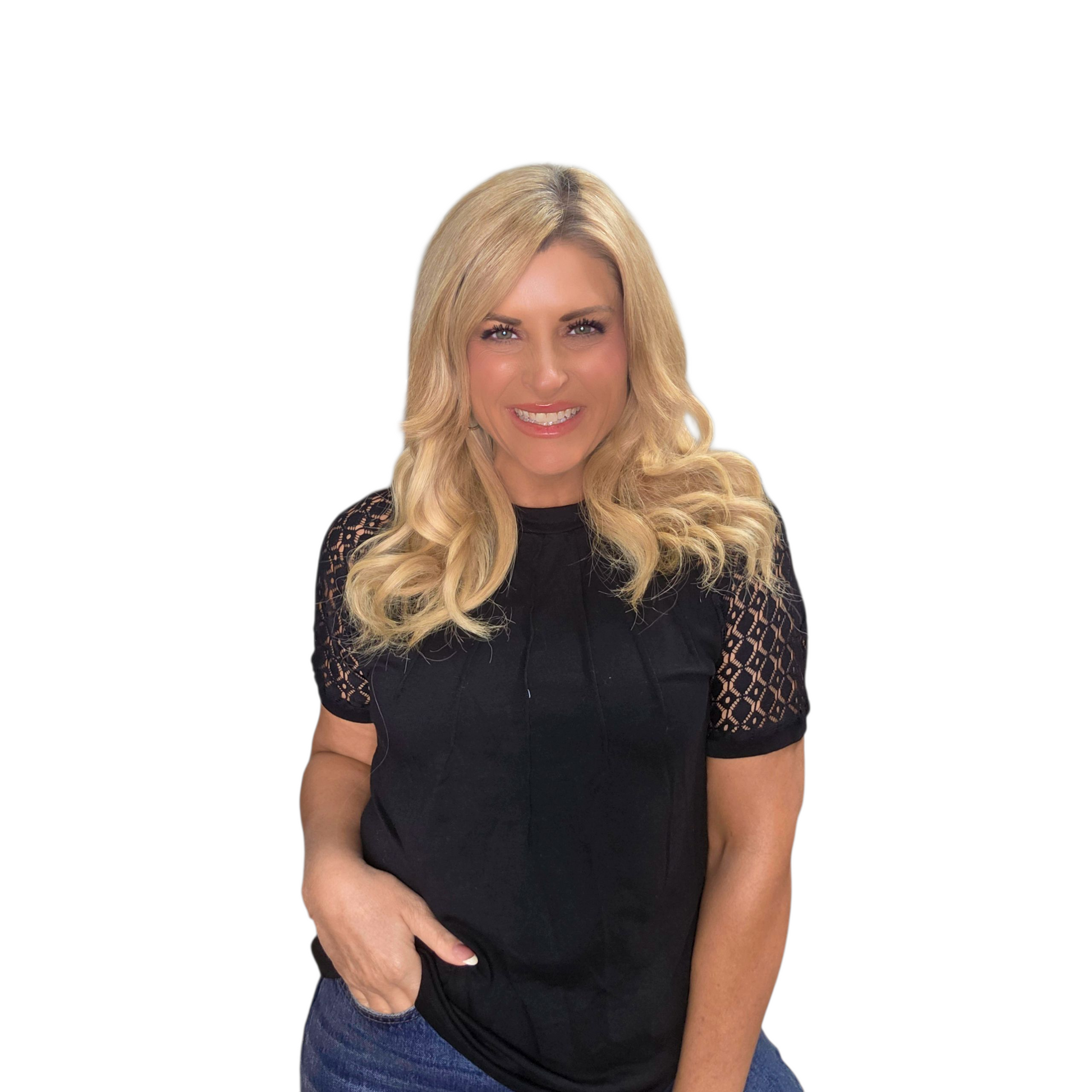 Lightweight and breezy, this black top is your summer go-to. Delicate neckline details and flirty lace sleeves add a touch of unique flair. Dress it up or down – it's the versatile staple your wardrobe craves.