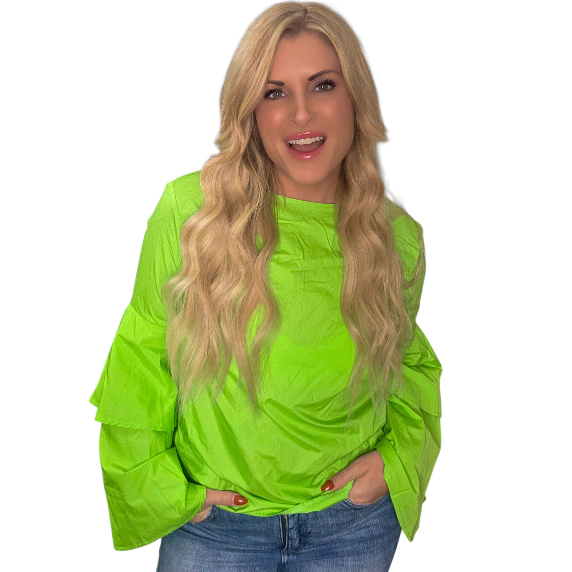 Introducing our long sleeve green top with oversized bell sleeves – a powerhouse piece that exudes confidence and style! Made for those who want to make a statement, this top features dramatic bell sleeves that command attention wherever you go. The vibrant green color adds a pop of personality to any outfit, while the oversized silhouette adds a touch of drama and flair. Crafted from high-quality fabric, this top is as comfortable as it is stylish, making it perfect for both work and play. Pair it with jeans for a casual weekend look, or dress it up with tailored pants for a chic office ensemble. However you choose to wear it, this top is sure to become a staple in your wardrobe!