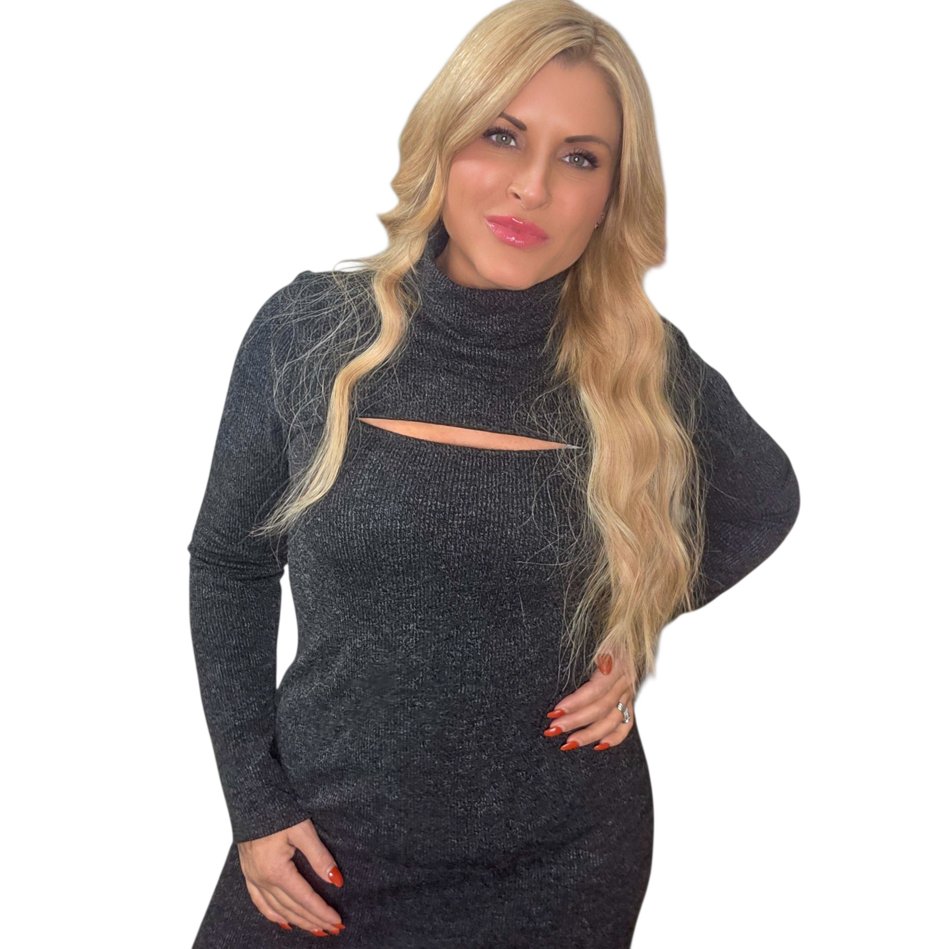 Elevate your fall and winter wardrobe with this effortlessly chic dress. Crafted from a luxurious rib knit fabric, this piece offers both comfort and style. The mock neck adds a touch of sophistication, while the daring cutout detail brings a modern edge. Perfect for a night out or dressed down with sneakers for a casual look.